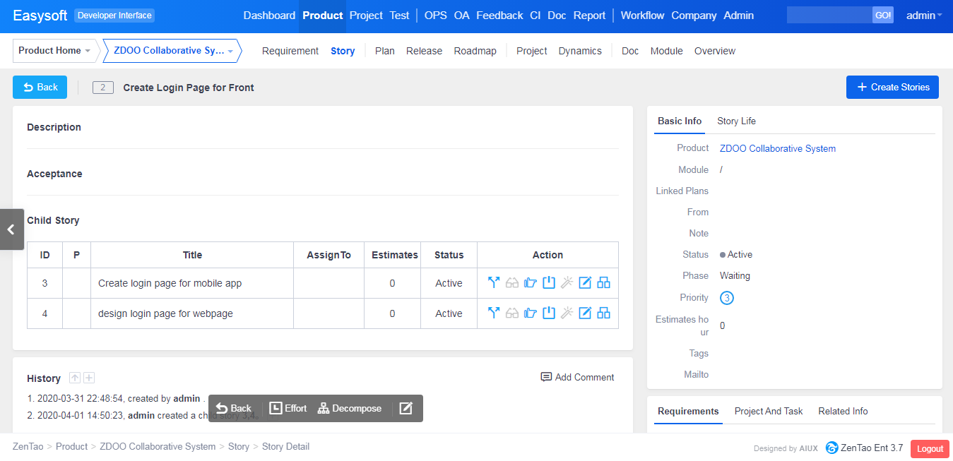 The parent-child story allows users to manage stories more conveniently. Parent stories cannot be linked with plans and projects. Only child stories can be linked with plans and projects. Multiple child stories of a parent story can be linked with multiple plans and projects.