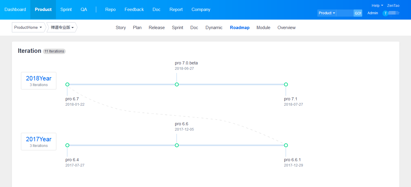 ZenTao , plans and releases constitute the roadmap of products. With a roadmap, you can have an intuitive understanding of the previous builds and future plans of the products. As shown in the screenshot below, the green circle represents the previous builds.
